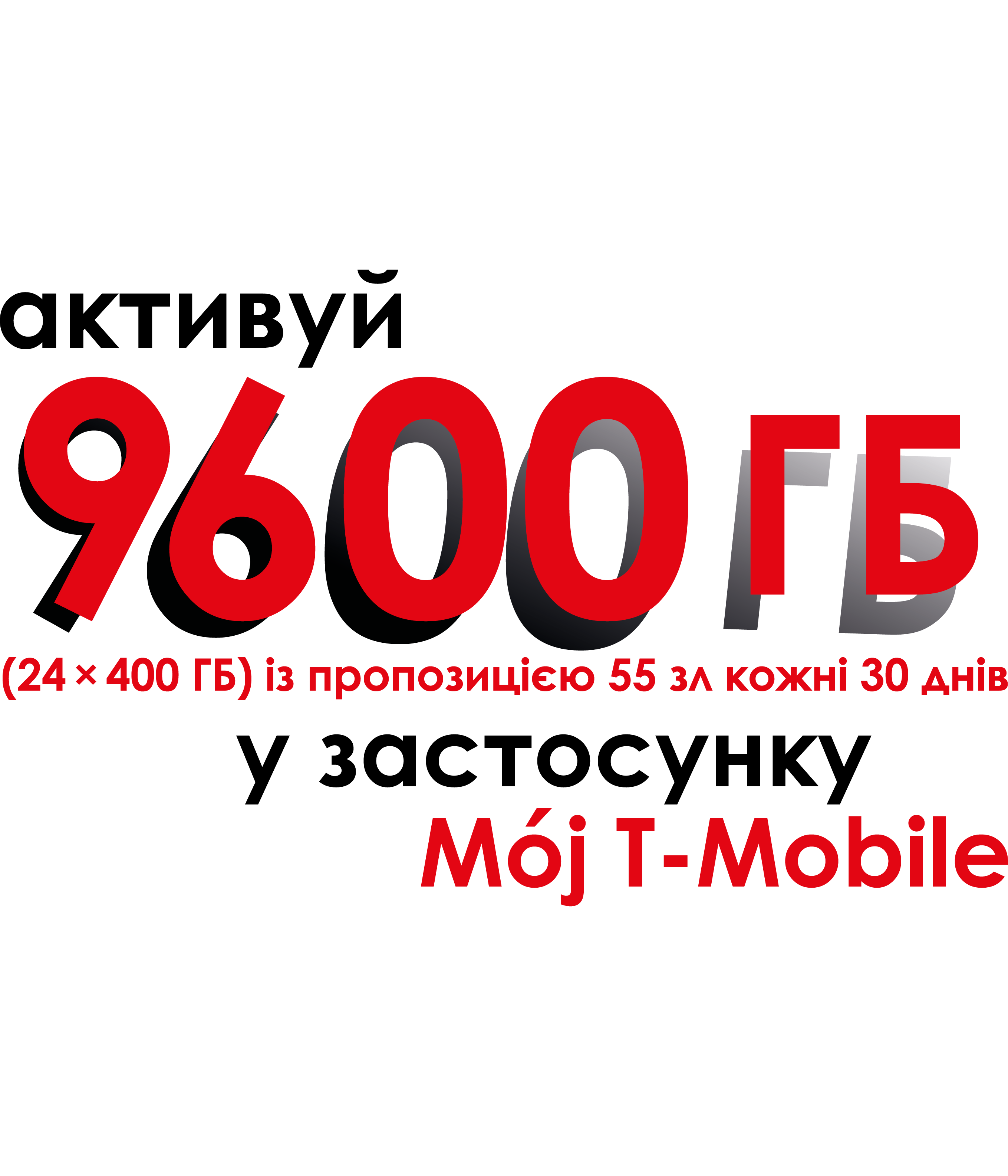 9600 ГБ (24 x 400 ГБ) на 2 роки з «Пропозиція L» за 55 злотих кожні 30 днів або «Пропозиція M» за 40 злотих кожні 30 днів і 4800 ГБ (24 x 200 ГБ) на 2 роки з «Пропозицією S» за 35 злотих кожні 30 днів — це сума 24 пакетів по 400 ГБ або 200 ГБ для використання протягом 730 днів, з моменту активації першого пакету в додатку My T-Mobile, що надається кожні 30 днів, за умови, що активована повторювана пропозиція, зазначена в умовах «GB на 2 роки», буде поновлена. Деталі в умовах положень, на www.heyah.pl та в додатку Mój T-Mobile.